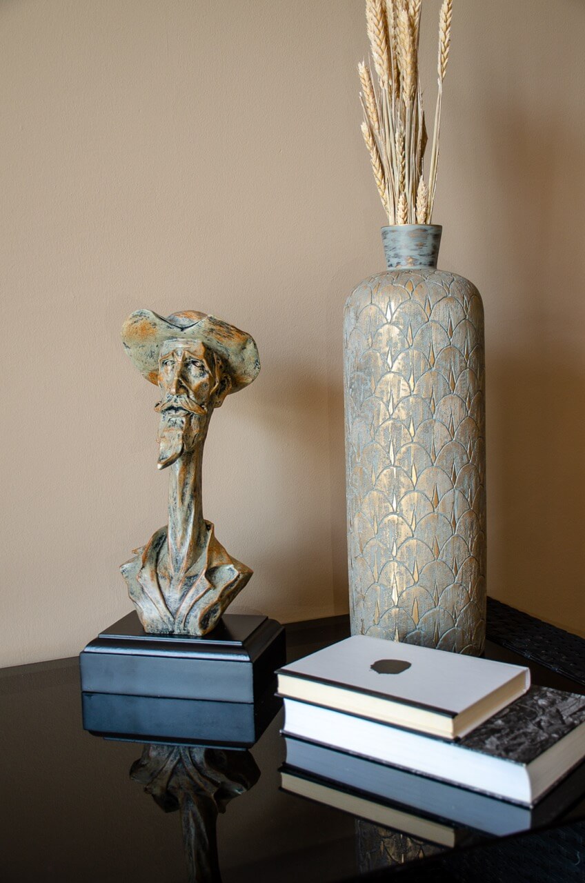 Akár polcon, akár íróasztalon van elhelyezve, ez a quixote ősi figura férfifej biztosan magára vonja a figyelmet és csodálatra késztet. Kézzel készített konstrukciója és a részletekre való odafigyelése egyedülálló darabbá teszi, amely az elkövetkező években is értékes lesz.